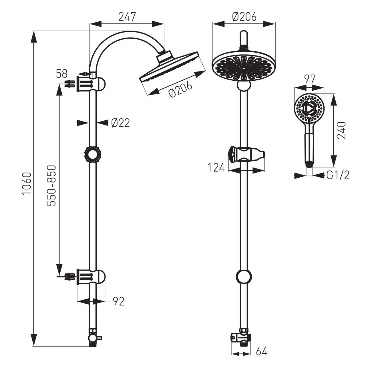• bară metalică de duș fixă 1060 mm;